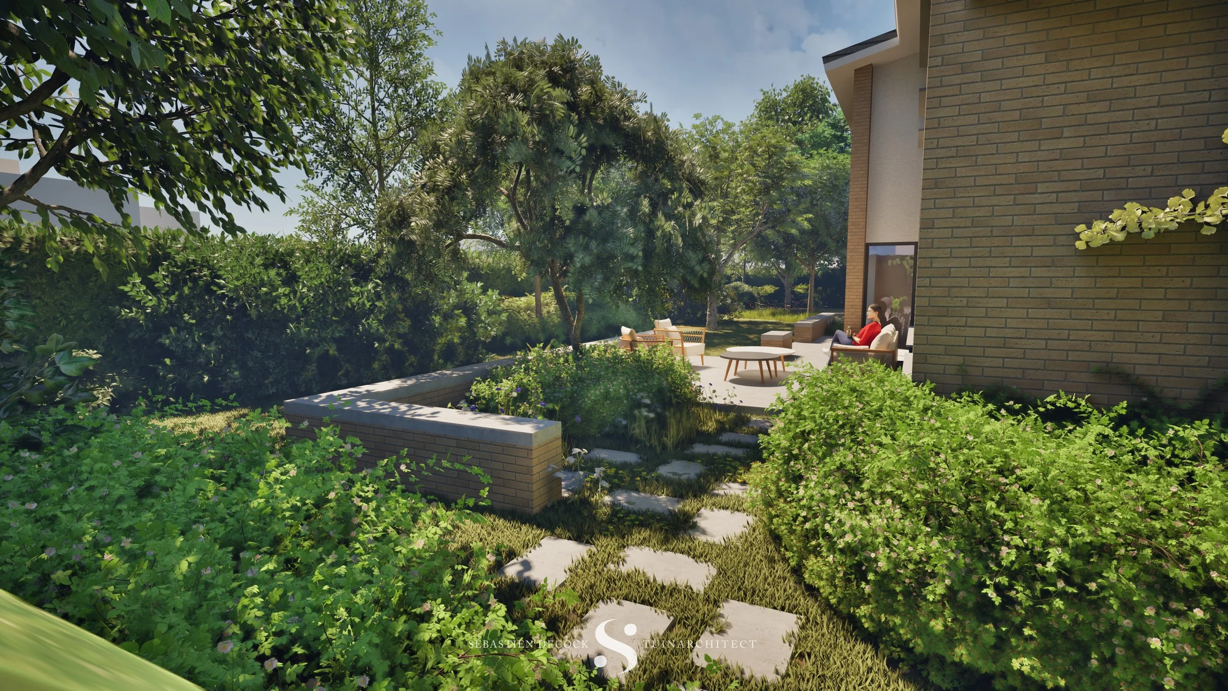 De architectuur van de woning wordt doelbewust ondersteund door de tuinmuren, die niet enkel het geheel visueel verankeren, maar ook een gevoel van geborgenheid creëren op de terrassen rondom het huis.