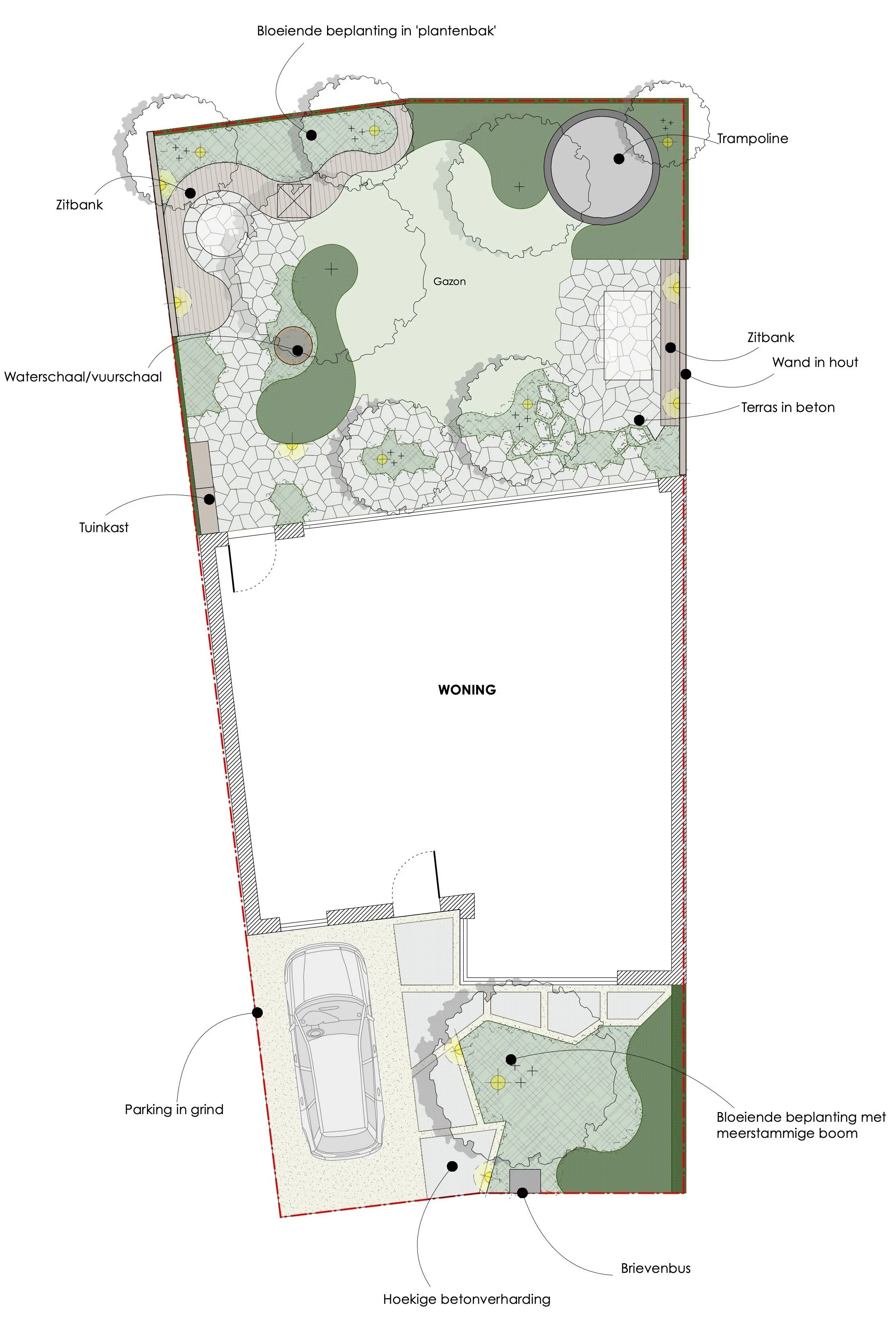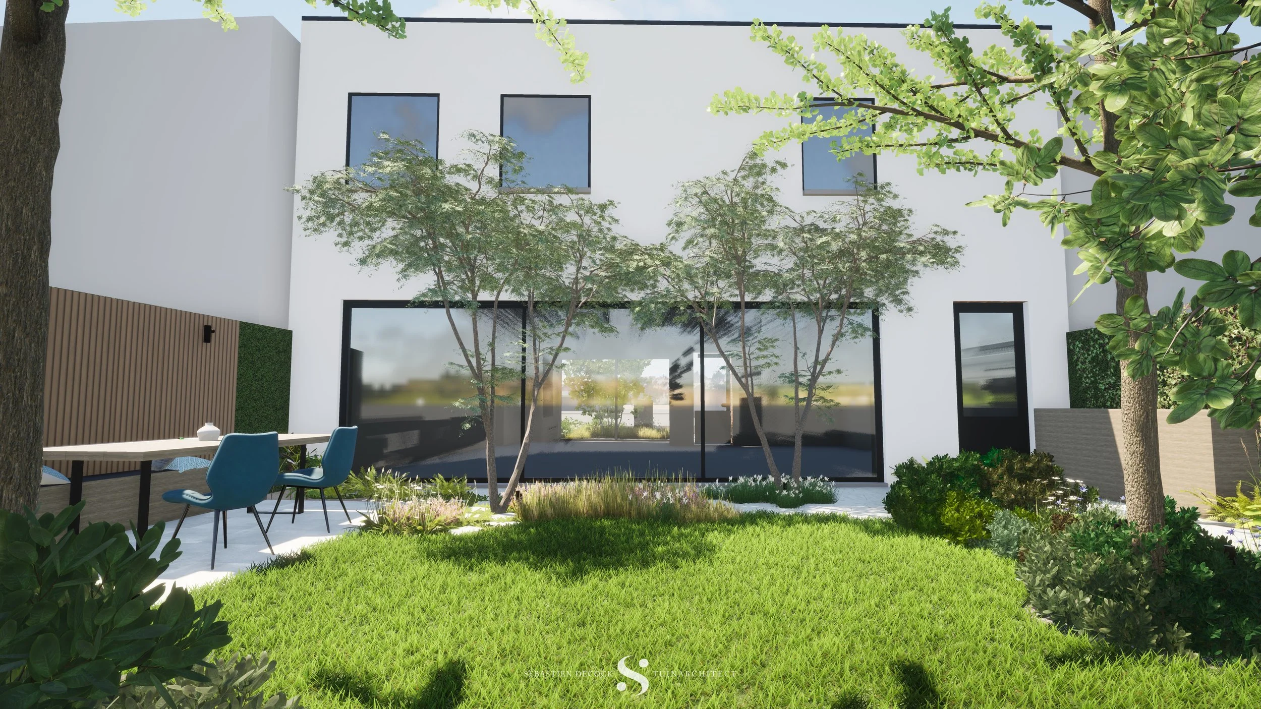 Deze compacte wijktuin in Roeselare beslaat 92 m², maar het resultaat voelt allesbehalve klein aan. De beplanting volgt vloeiende, organische lijnen die bewust afwijken van de rechte perceelgrenzen, wat een speelser geheel creëert. Grote, meerstammige bomen brengen in de zomer aangename schaduw, terwijl hun bladverliezende karakter in de winter voldoende licht doorlaat.