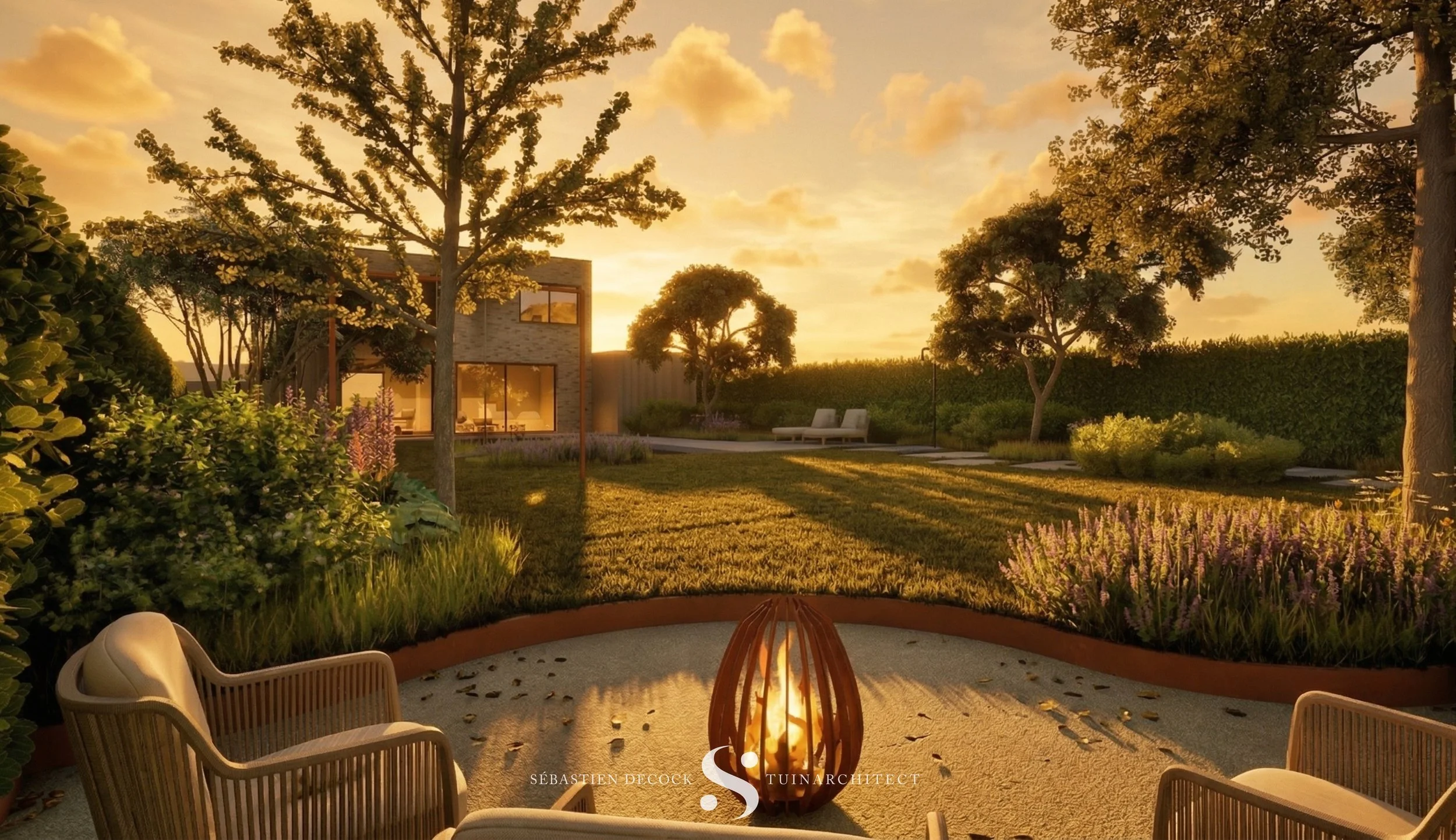 Een intieme eyecatcher in deze buitenruimte is de ronde zithoek met de sculpturale vuurschaal in cortenstaal. Deze knusse cocon nodigt uit tot vertragen en samen zijn, omringd door bloeiende borders en de rustgevende warmte van het vuur.