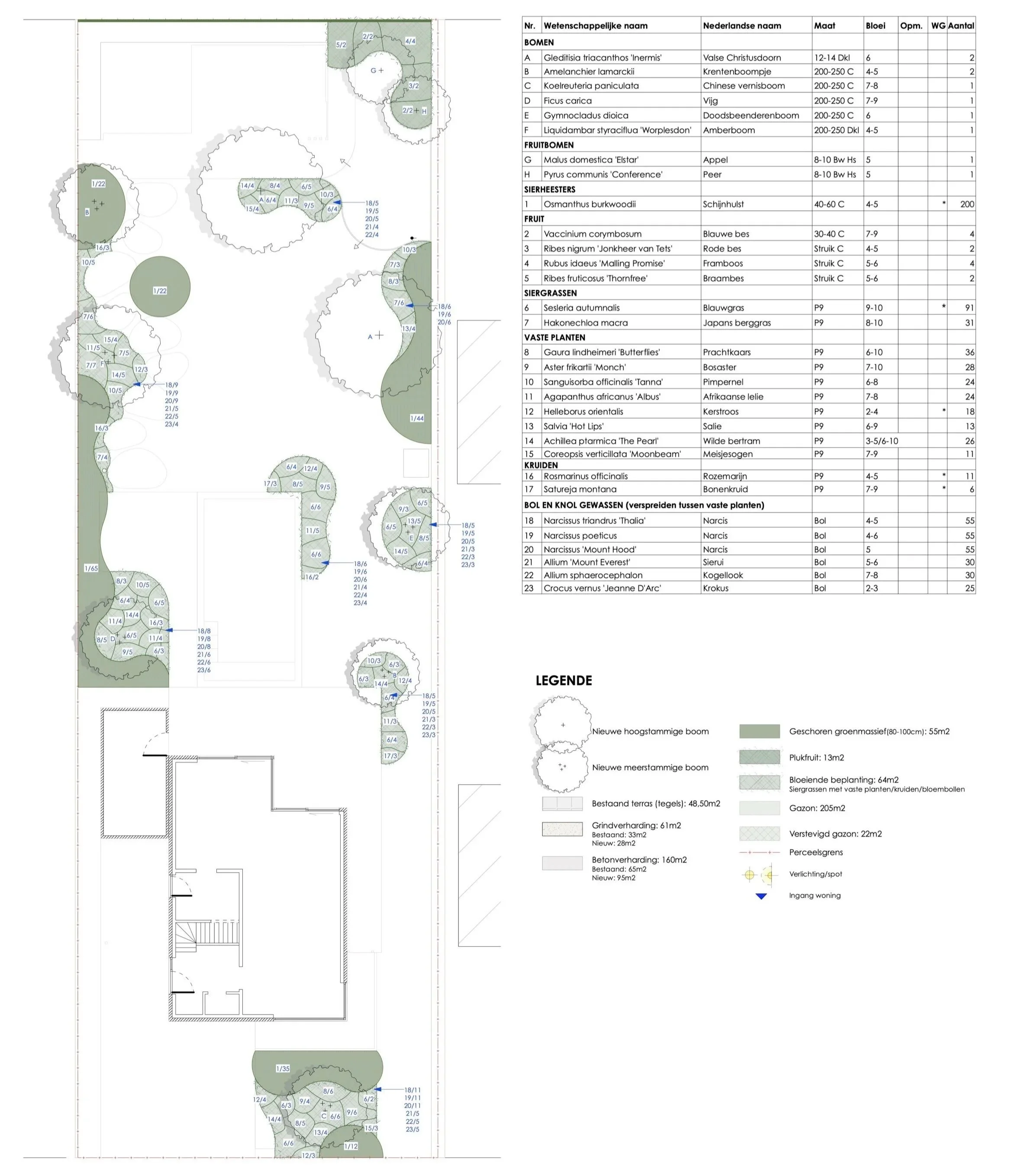 Vanuit het buikgevoel als ontwerper hebben we ervoor gekozen om een dynamisch beplantingsplan te maken dat de strakke verharding verzacht. Weelderige massieven van geurende lavendel, siergrassen en veldbloemen zoals madeliefjes brengen kleur, textuur en beweging in de tuin. De zorgvuldig geplaatste meerstammige bomen zorgen voor diepte en filteren het zonlicht, wat resulteert in een prachtig, zacht schaduwspel op het gazon.