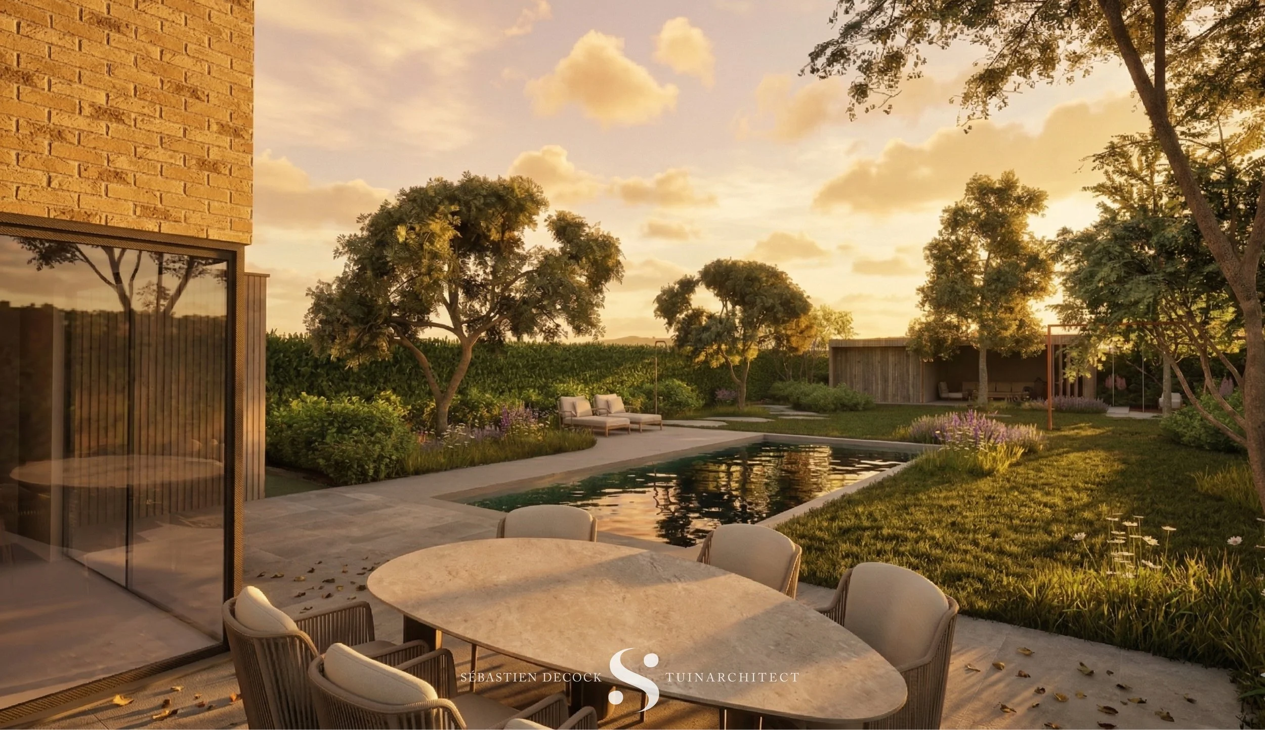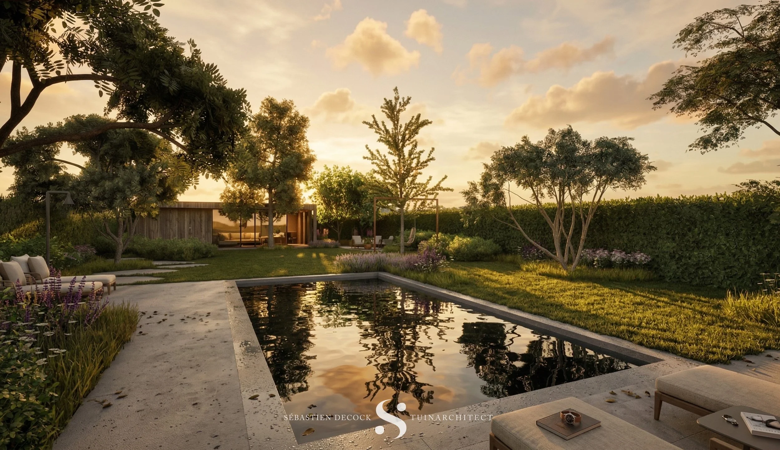 Centraal in het ontwerp ligt het strakke, donkere zwembad. Het wateroppervlak fungeert als een spiegel voor de lucht, de bomen en de architectuur. Zeker wanneer de zon laag staat en de tuin baadt in een warme, gouden gloed (het zogenaamde golden hour), creëren de reflecties op het water en in de grote raampartijen van de woning een haast magische sfeer.